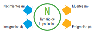 - Migración: entrada (inmigración) y salida (emigración) de individuos.